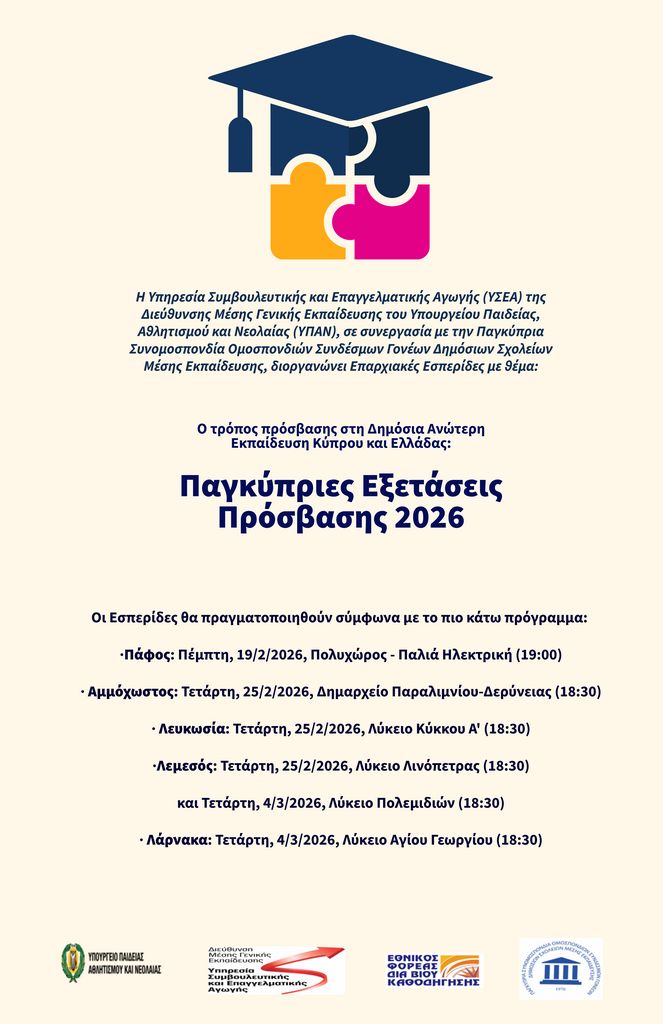 - Ιανουάριος 2026 - Σας ενημερώνουμε για το ακόλουθο: Ημέρα Ενημέρωσης Προπτυχιακών και Μεταπτυχιακών Προγραμμάτων Σπουδών του Τεχνολογικού Πανεπιστημίου Κύπρου (ΤΕ.ΠΑ.Κ.).