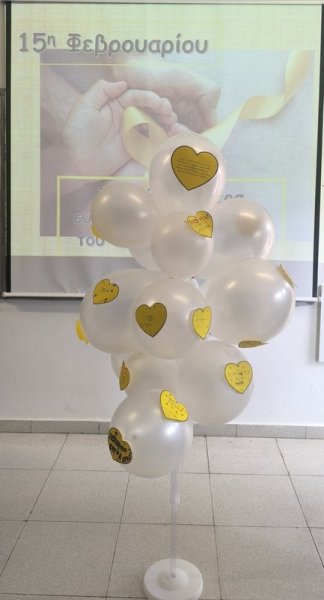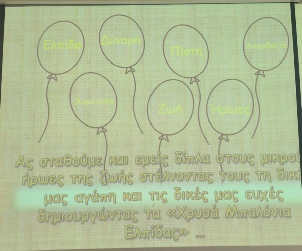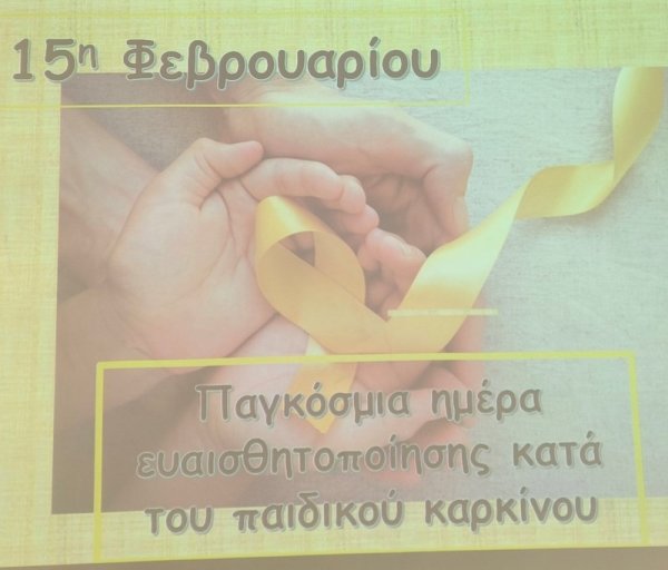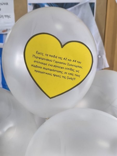 Με αφορμή την παγκόσμια ημέρα ευαισθητοποίησης κατά του παιδικού καρκίνου, ομάδα μαθητών της Α2 και Α4 του σχολείου μας, μαζί με τις καθηγήτριες Αγωγής Υγείας, Αδούλα Χατζηττοφή και Μαρία Ηλία, έστειλαν τη δική τους αγάπη και ευχές, ως σύμβολο συμπαράστασης, στους μικρούς ήρωες της ζωής, δημιουργώντας τα "Χρυσά Μπαλόνια Ελπίδας".